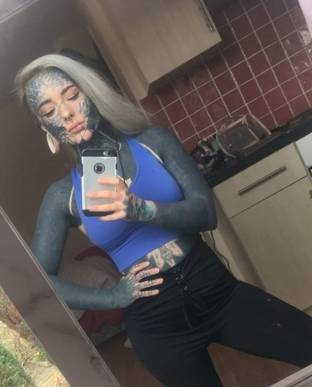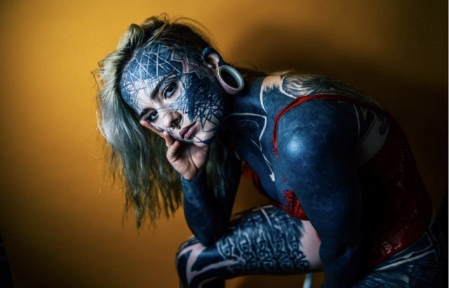 C’est alors que la petite fille est venue dire à son papa qu’elle rêvait, elle aussi, de se faire tatouer la peau. Mais son père lui a répondu sèchement qu’il n’en serait pas le promoteur. Nadine a donc trouvé un moyen d’obtenir l’argent elle-même.Tout a commencé par une visite dans un salon de tatouage et elle s’est retrouvée avec plus de 90 % de son corps recouvert de tatouages ! Nadine ne peut même pas vous dire combien elle en porte.