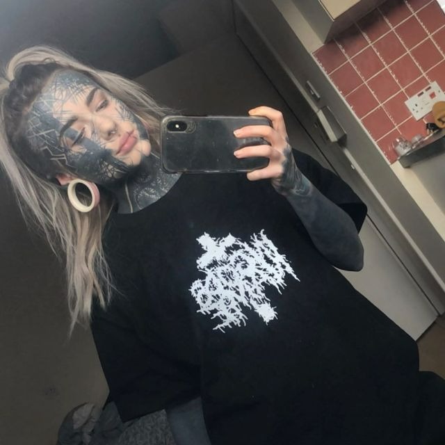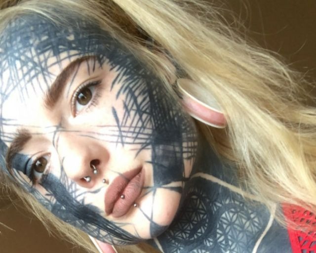 Mais la jeune fille ne s’est pas arrêtée aux tatouages ! Elle est fascinée par l’art de la scarification, si bien que son corps est également orné de quelques cicatrices. Nadine s’est également fait une séparation de la langue, elle a beaucoup de piercings.