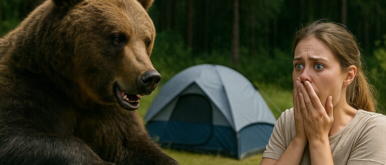 Une ourse se tenait près de la poubelle, frappant le couvercle avec ses lourdes pattes. Quand je l’ai ouverte, j’ai été figé d’horreur 😱😱 Notre camp se situe