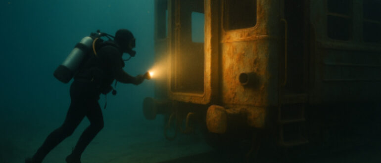 Il descendait lentement, comme glissant dans le passé lui-même. L’eau froide l’enveloppait de toutes parts, le silence tintait à ses oreilles, et le faisceau de sa lampe ne