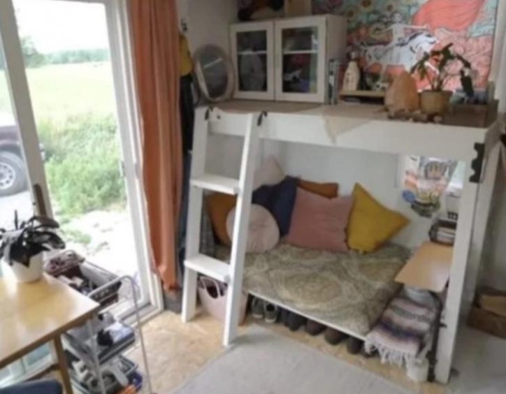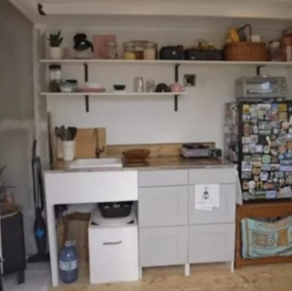 La cuisine, petite mais fonctionnelle, comprend un évier utilisé pour le moment comme rangement pour la vaisselle, et un réchaud de camping, idéal pour cuisiner pour une personne. Les étagères ouvertes sont décorées de verres, d’assiettes et de provisions. Un petit réfrigérateur, offert par la mère de Heather, accueille des magnets ramenés de ses voyages. Le cabanon dispose également de nombreux rangements : boîtes pour la nourriture, les vêtements, les chaussures, les livres, ainsi qu’un composteur sous l’évier.