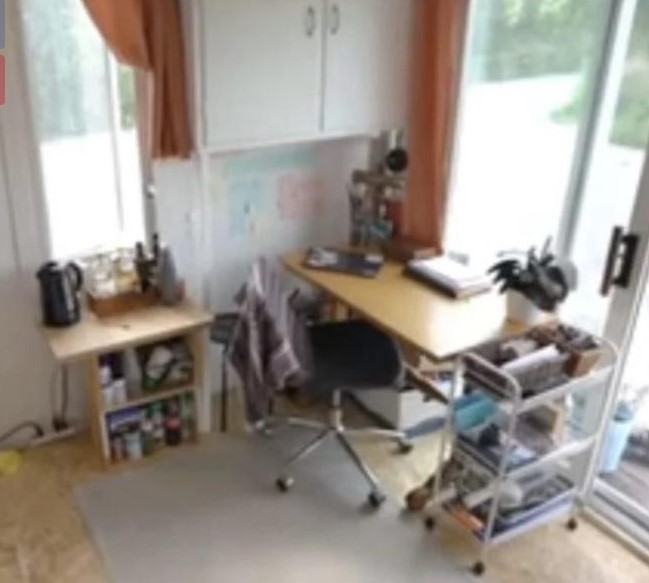 Pour Heather, cette vie est très concrète. De l’extérieur, sa maison paraît simple, car elle n’a fait que le strict nécessaire, ne sachant pas combien de temps elle y vivrait. Pourtant, l’intérieur contient tout ce dont elle a besoin. À droite de l’entrée se trouve son espace de travail, près d’une fenêtre offrant une vue pittoresque.