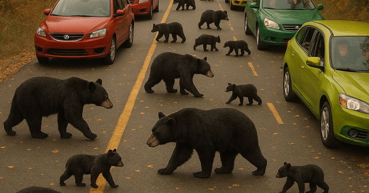 Du bois, directement sur l’asphalte, commencèrent à surgir des ours. Des dizaines d’ours. Certains grands et imposants, d’autres, de petits oursons trottinant près de leurs mères. Ils ne rugissaient pas, n’attaquaient pas, ne semblaient pas agressifs. Ils se déplaçaient plutôt avec une agitation silencieuse, comme si quelque chose d’invisible les poursuivait. Ils marchaient entre les voitures avec calme, ignorant les klaxons et les cris des conducteurs. C’était une scène irréelle : une colonne interminable d’ours traversant la route, comme s’ils quittaient leur foyer pour toujours.
