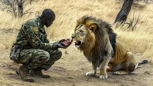 Le lion tremblait, comme s’il avait peur — puis il fit un pas et commença à manger.