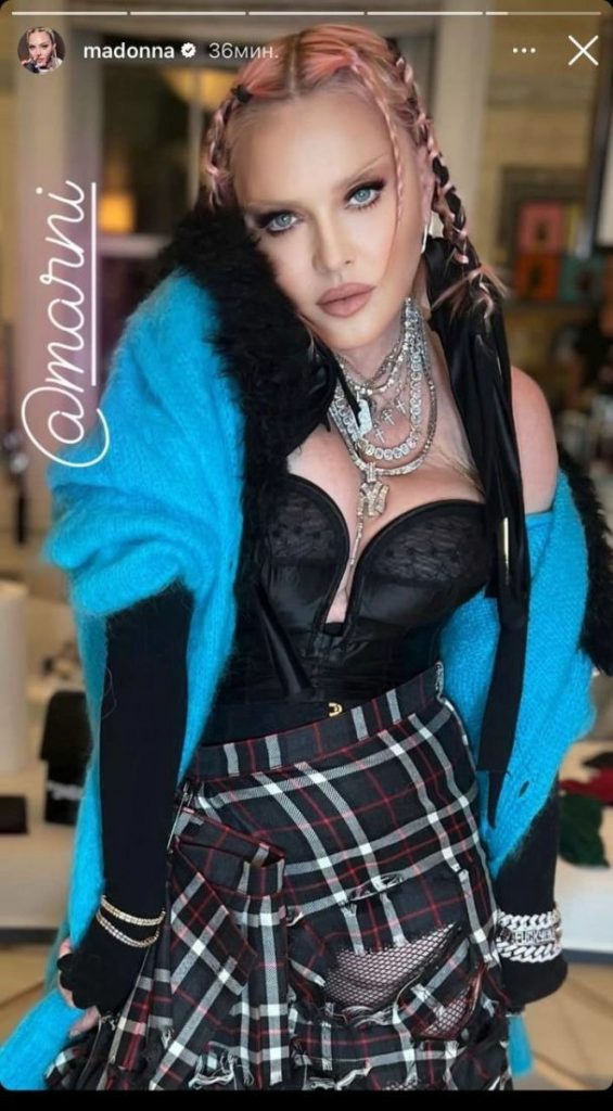 Une photo de la star prise sans l’aide de Photoshop a notamment été publiée en ligne. L’apparence de la star sur ces photos ne lui ressemble pas du tout. Cette fois, elle a opté pour un corset noir, une jupe à carreaux et des collants en résille. La célébrité a complété son image avec des bijoux. Madonna s’est également maquillée et a éclairci ses sourcils.