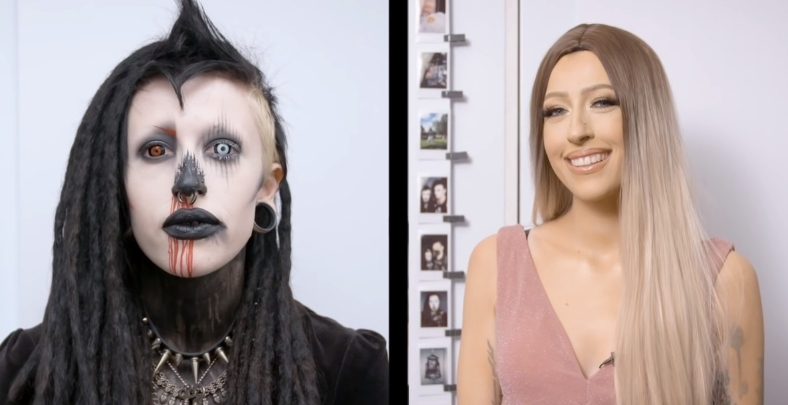 La transformation a commencé par l’effacement complet de son maquillage gothique emblématique. Ensuite, le relooking a été total et méticuleux. Un bronzage artificiel a modifié son teint pâle, un contouring prononcé a redessiné ses traits, tandis que des sourcils parfaitement sculptés et de faux cils dramatiques ont créé un look glamour et sophistiqué. Chaque étape l’éloignait un peu plus de l’esthétique sombre qu’elle avait mis des années à perfectionner.