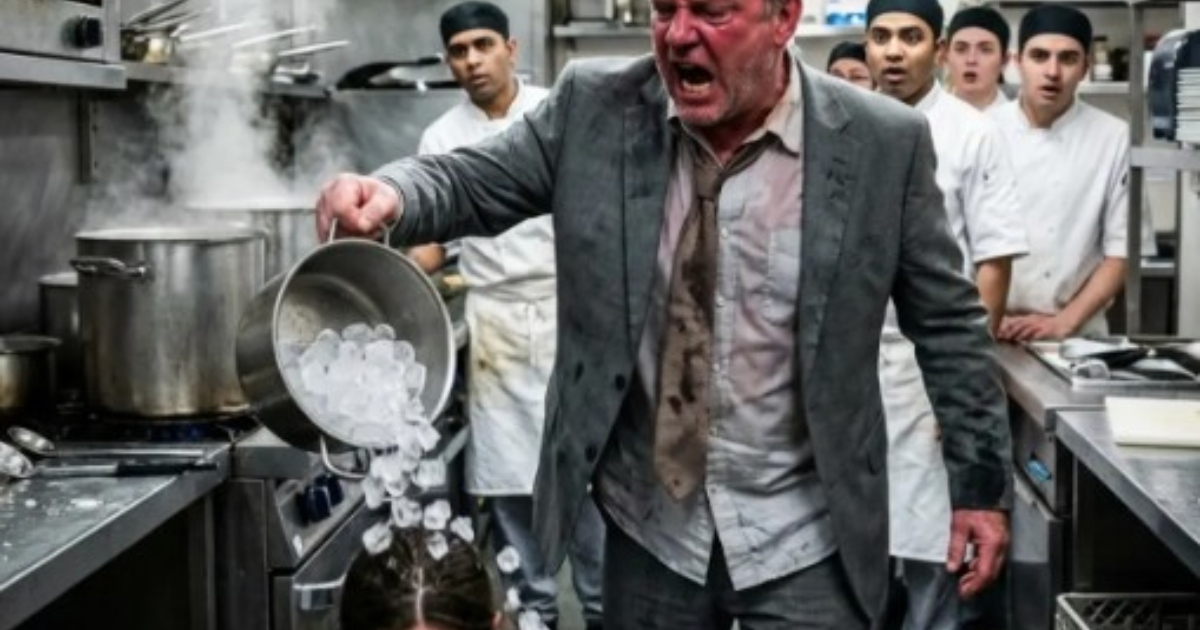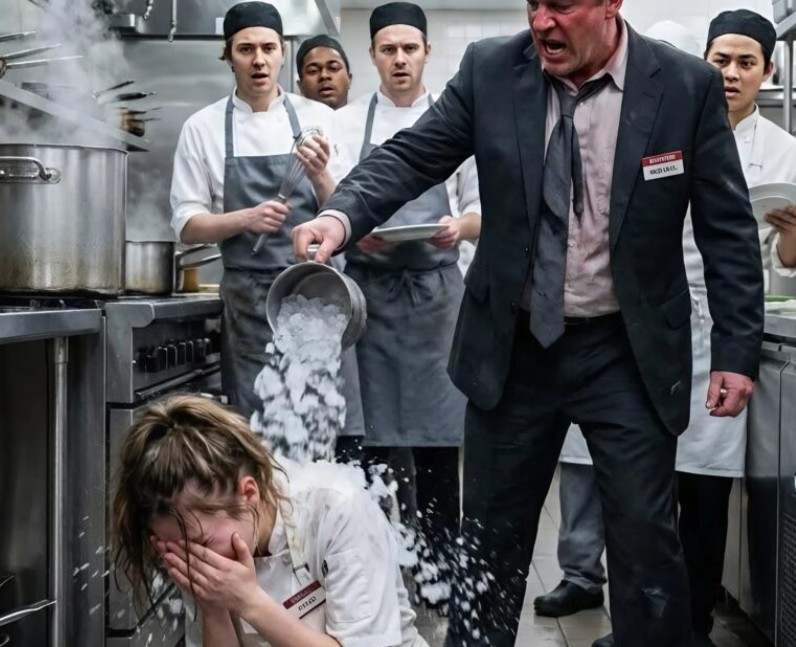 Fou de rage, le directeur fit irruption dans la cuisine et commença à réprimander Marie sévèrement devant tout le monde. Ne se contentant pas de paroles, il la força à s’agenouiller et, saisissant un seau rempli de glace d’une table, le renversa sur sa tête. Les morceaux de glace éclatèrent sur le sol, et un silence mortel s’abattit dans la cuisine. Les autres employés, horrifiés par ce châtiment cruel, n’osaient intervenir. Mais c’est alors qu’un événement inattendu survint.
