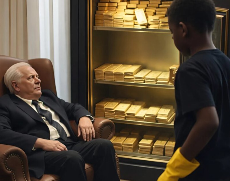 Il reposa le lingot à sa place et referma doucement le coffre. Ensuite, il s’approcha du fauteuil où reposait le vieil homme. Le milliardaire s’attendait à voir l’enfant glisser de l’argent dans ses poches, mais au lieu de cela, le garçon arrangea la couverture qui avait glissé et la remit soigneusement sur ses épaules.