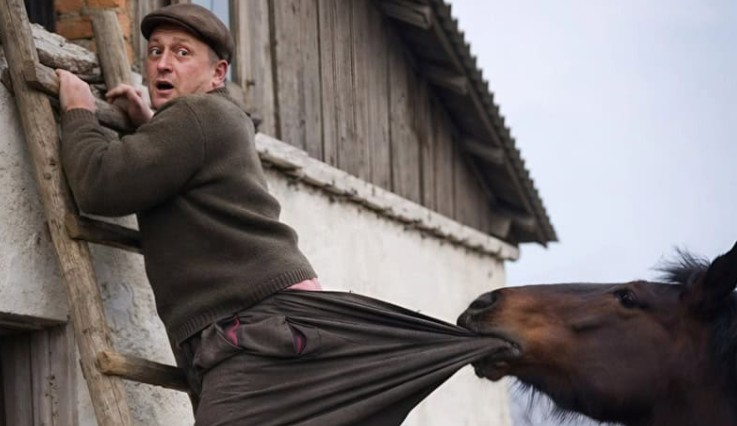 Zinaida, assise sur un tabouret dans le jardin, éclata de rire en voyant son mari suspendu à l’échelle, complètement impuissant. Fedor tentait tant bien que mal de se libérer de son pantalon tout en criant : « Arrête de rire et aide-moi ! » Même les voisins s’étaient rassemblés derrière la clôture pour admirer cette scène comique. Buyan, quant à lui, semblait juré de protéger son maître d’une grave erreur, en plantant ses sabots au sol et en tirant sans relâche.