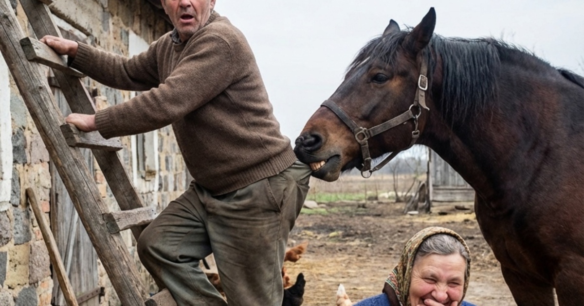 Zinaida, assise sur un tabouret dans le jardin, éclata de rire en voyant son mari suspendu à l’échelle, complètement impuissant. Fedor tentait tant bien que mal de se libérer de son pantalon tout en criant : « Arrête de rire et aide-moi ! » Même les voisins s’étaient rassemblés derrière la clôture pour admirer cette scène comique. Buyan, quant à lui, semblait juré de protéger son maître d’une grave erreur, en plantant ses sabots au sol et en tirant sans relâche.