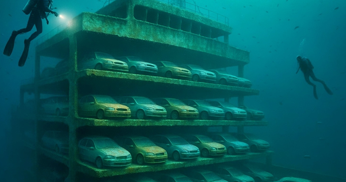 Dann, wie aus der blauen Tiefe auftauchend, zeichnete sich eine massive Gestalt ab. Zunächst dachten wir, es sei ein gewöhnliches Wrack… doch je näher wir kamen, desto mehr erstarrten wir vor Staunen. Vor uns ragte ein riesiges Schiff empor, ein wahrer Unterwasser-Koloss, Stockwerk für Stockwerk mit Autos gefüllt. Sie standen so perfekt geordnet, dass es aussah, als hätte jemand sie erst gestern hineingestellt. Doch Salz, Algen und Moos hatten sie längst überzogen. Ein Schauer lief mir über den Rücken, als ob das Wasser direkt unter meine Haut kriechen würde. Mein Freund legte mir die Hand auf die Schulter und fragte nur mit Blicken: „Siehst du das auch?“