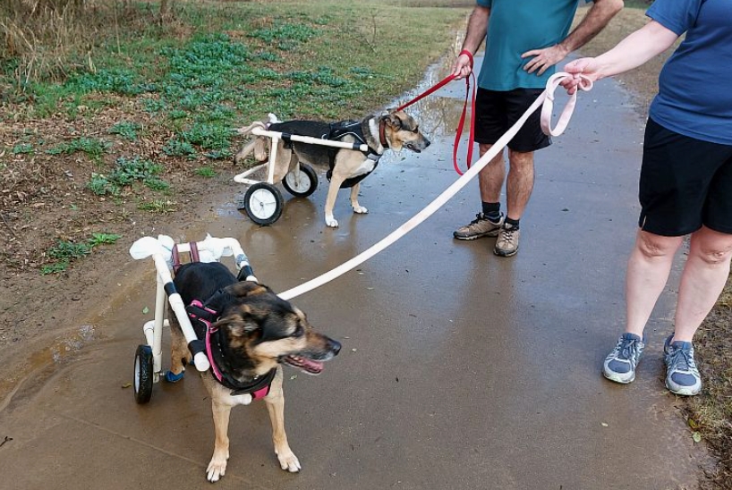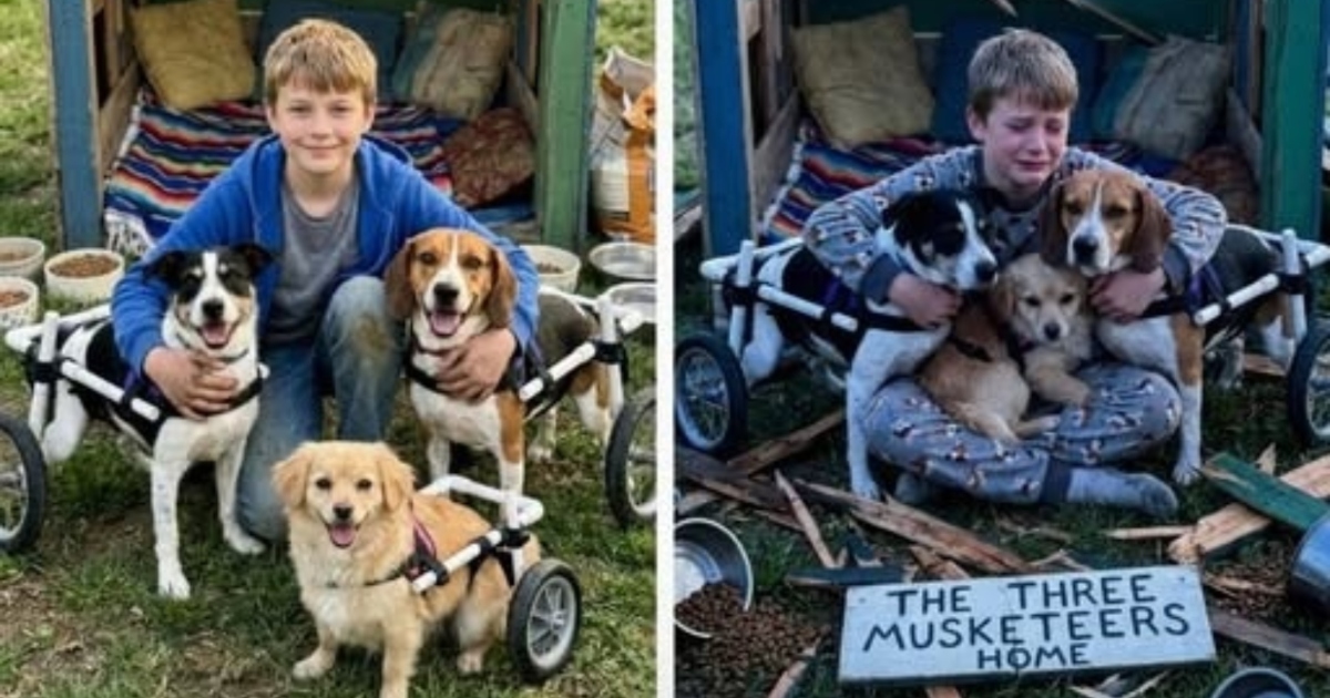Notre jardin s’est rapidement transformé en un atelier improvisé, où Ethan rassemblait de vieilles pièces de vélo, des roues de poussette et des tuyaux en PVC pour fabriquer des chariots de mobilité sur mesure. Avec des gestes précis et une patience sans fin, il a construit de petits fauteuils roulants permettant aux chiens d’avancer et de retrouver un semblant de liberté. Les voir faire leurs premiers mouvements sur roues a apporté une joie que notre foyer n’avait pas ressentie depuis longtemps. Mais Ethan ne s’est pas arrêté là : il a utilisé toutes ses économies pour construire un abri solide et isolé, afin d’offrir aux chiens un véritable foyer.