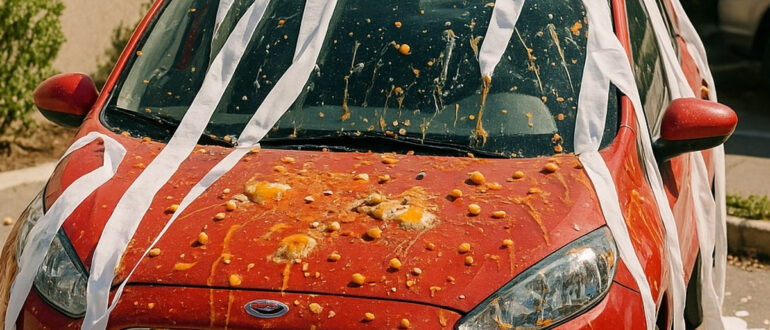 La matinée précédant Halloween, Emily ouvrit la porte de sa maison et découvrit sa voiture recouverte de jaune d’œuf et de papier hygiénique. — Maman… la voiture est