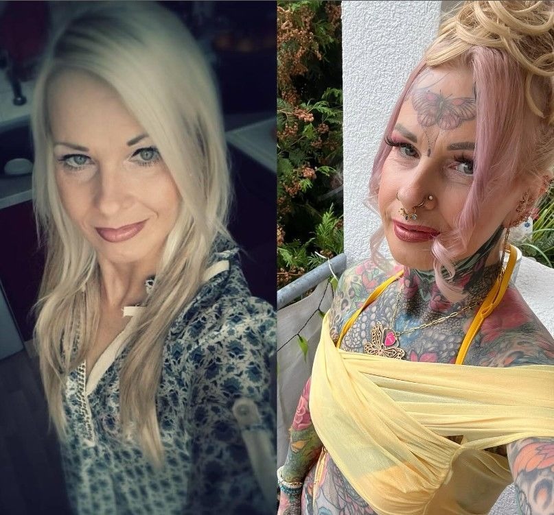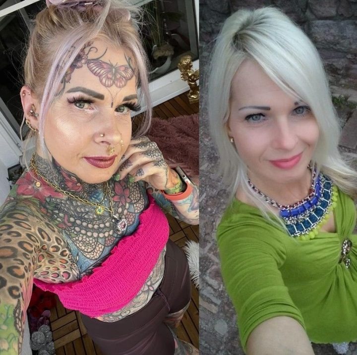Sur la photo initiale, Kerstin apparaît sans tatouages visibles, vêtue d’une tenue plutôt conservatrice. Neuf ans plus tard, son apparence a radicalement changé : ses bras, son cou, son torse et son front sont désormais ornés de tatouages complexes. Elle arbore également plusieurs piercings au nez et aux oreilles.