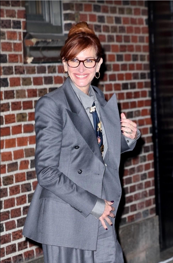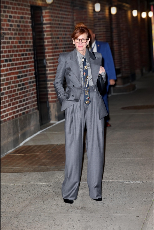 Les paparazzis l’ont photographiée alors qu’elle quittait le plateau de The Late Show with Stephen Colbert. Julia Roberts portait un costume gris ample, aux revers allongés, avec une veste légèrement structurée et un pantalon à la coupe résolument masculine. Elle a complété l’ensemble avec une chemise impeccable et une cravate bleu marine à motifs, pièce forte du look qui a immédiatement attiré tous les regards.