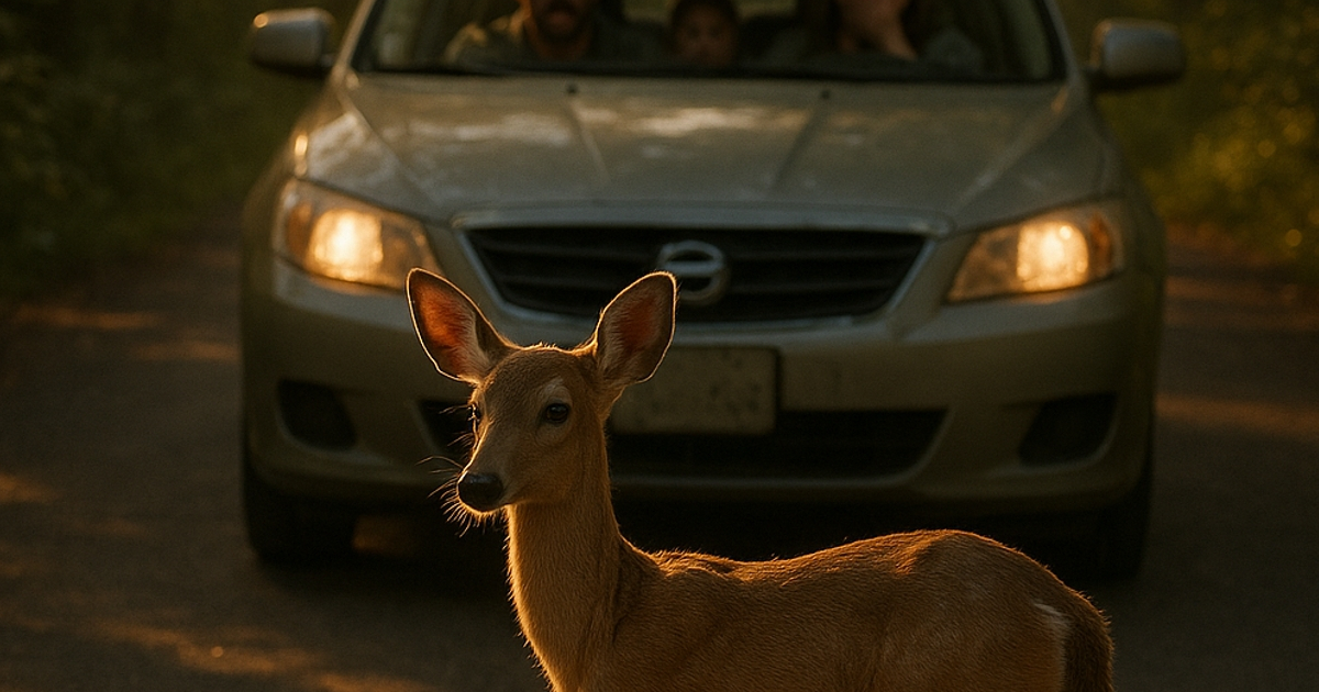 Jeune, couleur brun clair, avec des yeux reflétant le ciel. Il avançait lentement, sachant exactement où il allait. Il s’arrêta au milieu de la route, juste devant la voiture.