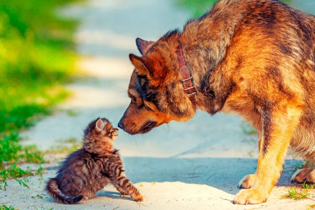Sur le tapis — le chien, prenant soin du petit chaton. Il leva les yeux vers sa maîtresse, comme pour demander : « C’est permis ? »