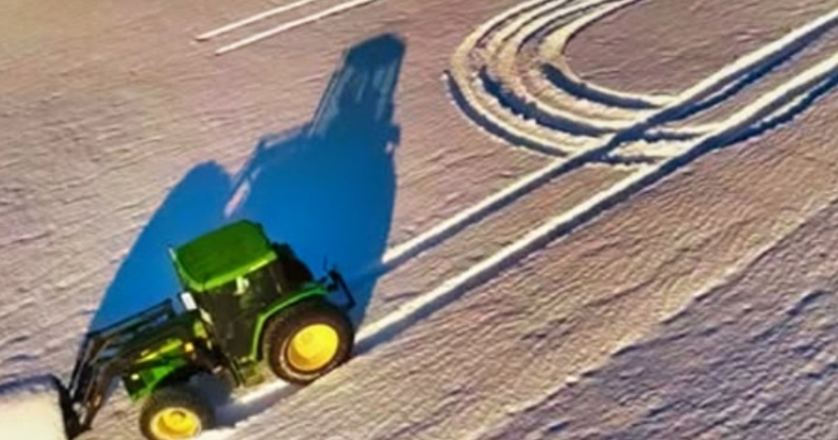 Heureusement, grâce à son expérience et à sa maîtrise du tracteur, Dan a relevé le défi avec brio. Sous ses roues, la neige s’est transformée en œuvre d’art éphémère : chaque lettre, chaque courbe du message prenait forme avec une exactitude impressionnante. Ce qui aurait pu être une simple tâche agricole s’est mué en une magnifique création de land art hivernal, digne d’un tableau vivant.