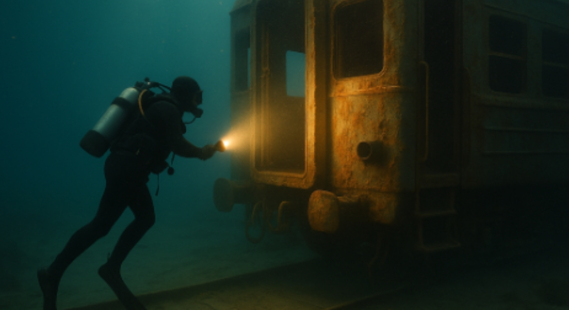 À plus de vingt mètres de profondeur, le plongeur aperçut quelque chose qui coupa sa respiration. Dans le sable, à moitié enseveli sous la vase, se tenait un train. Un vrai train, rouillé, enveloppé d’algues, figé dans l’éternité. Wagon après wagon, comme un cortège fantomatique, il s’étendait à l’infini.