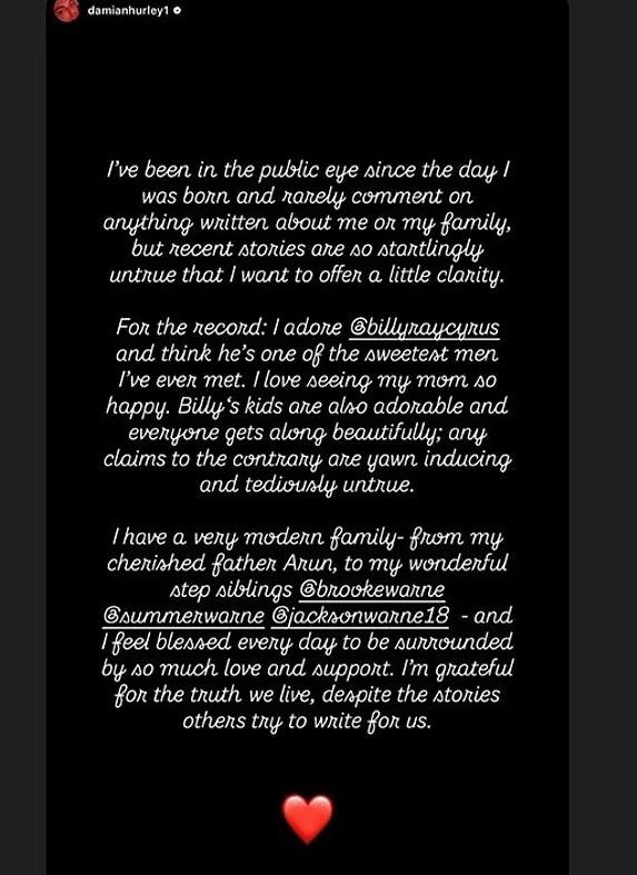 Damian reflektierte außerdem über die sich entwickelnde Familienstruktur und beschrieb sie als „moderne Familie“, die auch seinen früheren Stiefvater Arun Nayar einschließt. Er drückte Dankbarkeit für die Liebe und Unterstützung in seinem Umfeld aus, schrieb, dass er sich „jeden Tag gesegnet fühlt“, und betonte, dass die Wahrheit ihres Lebens wichtiger sei als die Geschichten, die andere schreiben. Billy Ray teilte Damians Botschaft erneut und schrieb dazu: „Love you D Man“, was die echte Herzenswärme zwischen ihnen zeigt.