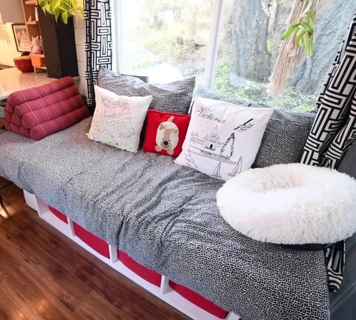 Le canapé est fait de deux étagères Ikea posées sur leurs côtés, surmontées d’un matelas qui peut être un canapé et une zone de couchage. Elle a ajouté des étagères amovibles en dessous pour ranger les jouets de son chien Tucker, ses matériaux de loisirs et ses chaussures.