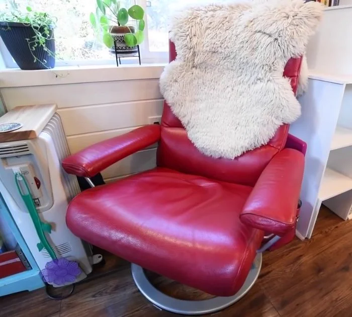 Le fauteuil est à côté d’un radiateur rempli d’huile pour la garder au chaud, et il a un bloc de bois poncé sur le dessus qui sert de table basse simple.