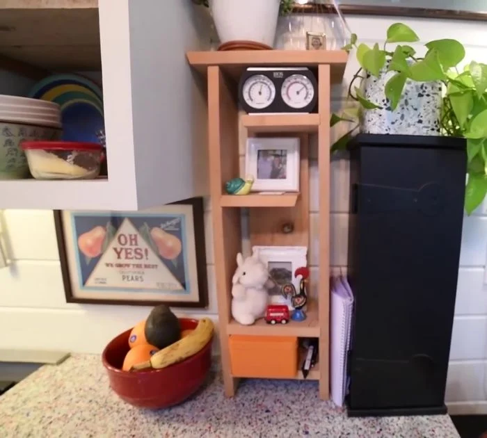 Allyson a quelques étagères, qu’elle a fabriquées lors d’un atelier de menuiserie pour femmes. Il y a un petit meuble qu’elle appelle son “bureau” car il contient la plupart de ses fournitures de bureau.