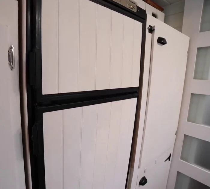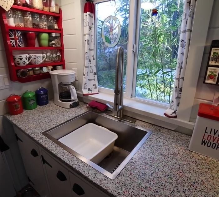 Vous trouverez un mur blanc soigné en face de son évier, et vous seriez surpris de savoir qu’il y a plus de rangement là-bas. C’est là qu’Allyson garde sa machine à laver-sécheresse, et en dessous, c’est là qu’elle garde ses fournitures de lessive et d’autres outils de maison.