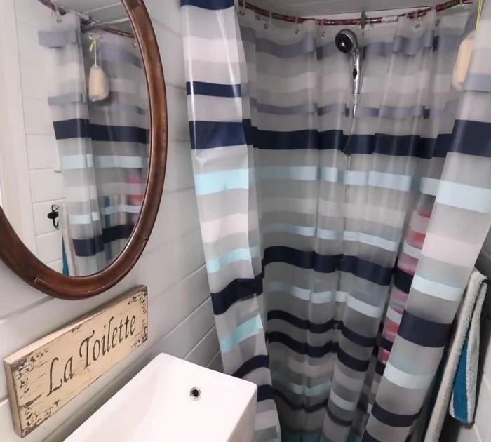 La salle de bains est la plus petite pièce de sa maison, mais Allyson a fait en sorte que ça fonctionne. Elle a utilisé des toilettes à compostage, une petite vanité étroite et un lavabo, et une petite zone de douche ronde avec un bassin profond galvanisé comme son plateau de bassin.
