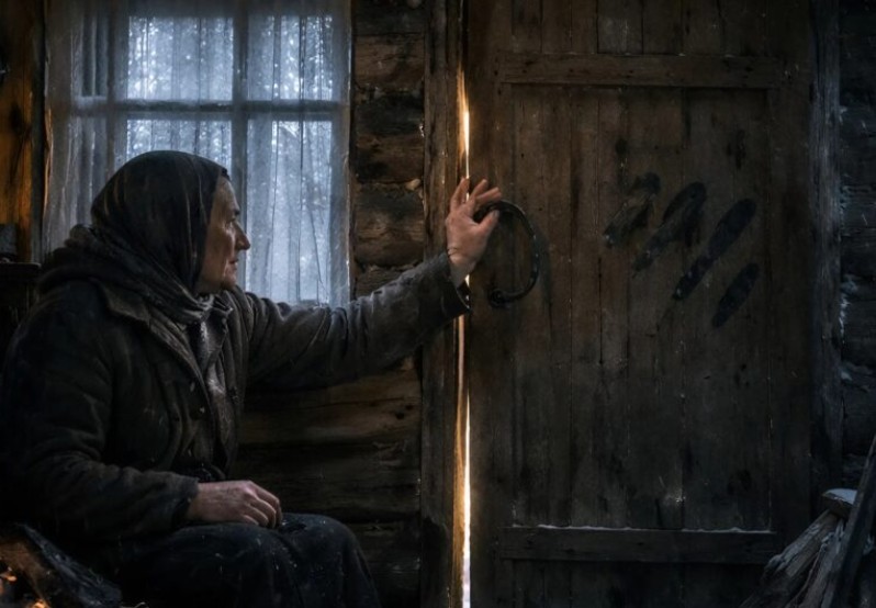 Une vieille femme, vivant en recluse dans sa bicoque de bois délabrée à l’orée du village, vit apparaître quatre étrangers sur son seuil par une nuit d’hiver glaciale. Ces hommes, au regard d’acier, au corps marqué de tatouages et lestés de sacs imposants, ne demandèrent qu’un refuge, prétendant que les routes étaient ensevelies sous la neige. Bien que leur allure inquiétante et la fortune dissimulée dans leurs bagages fissent frémir la vieille dame, sa conscience lui interdit de les abandonner à une mort certaine ; elle partagea alors avec eux son ultime mignardise de pain.