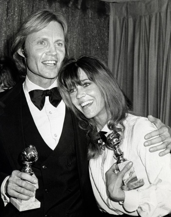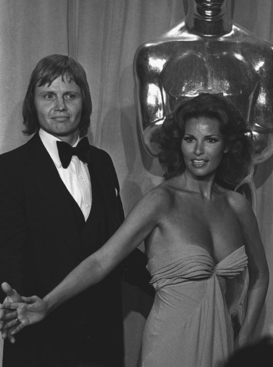 Au cœur de ce chaos magnifique se tenaient Jon Voight et Raquel Welch, un duo qui ressemblait à une contradiction délicieusement sophistiquée. Voight, âme tourmentée et intellectuelle de Midnight Cowboy, apportait au tapis rouge une intensité brute, presque avant-gardiste. À ses côtés, Welch — souveraine incontestée du magnétisme international — venait tout juste de remporter un Golden Globe et rayonnait d’une assurance affûtée, drapée de soie. C’était la rencontre de deux mondes : l’acteur de la méthode, sombre et audacieux, face à l’icône glamour et flamboyante, produisant l’étincelle parfaite de l’esthétique des années 70 — un mélange d’intellect et de glamour.